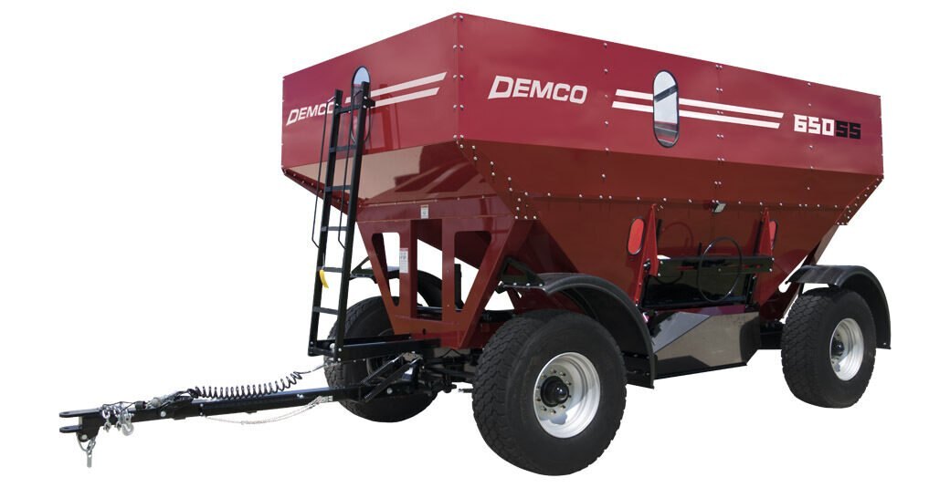 The Demco 650 SS grain wagon offers all the features of the 500 SS, including an easy-open door, dual-side chute access, reflective decals, lights, interior bracing to reduce splatter, large viewing windows, and extra chute clearance. It holds 650 bu with a 108" wide and 17'8" long box, a tight 37' turning radius, and 60" door openings. Weighing 6,700 lbs., it stands 10'2" tall on 22.5 tires with strong 10-bolt hubs. Bushel capacity is based on #2 corn at 15% moisture.