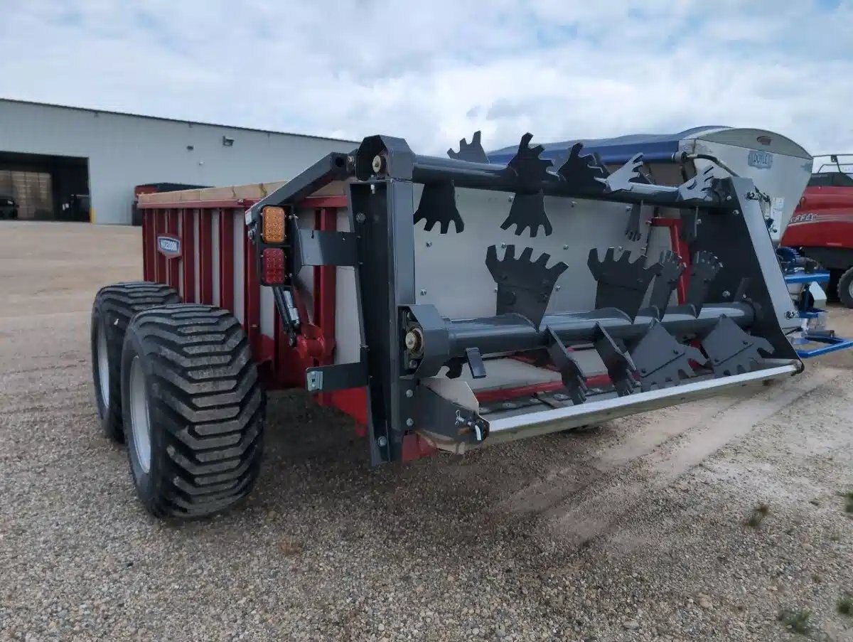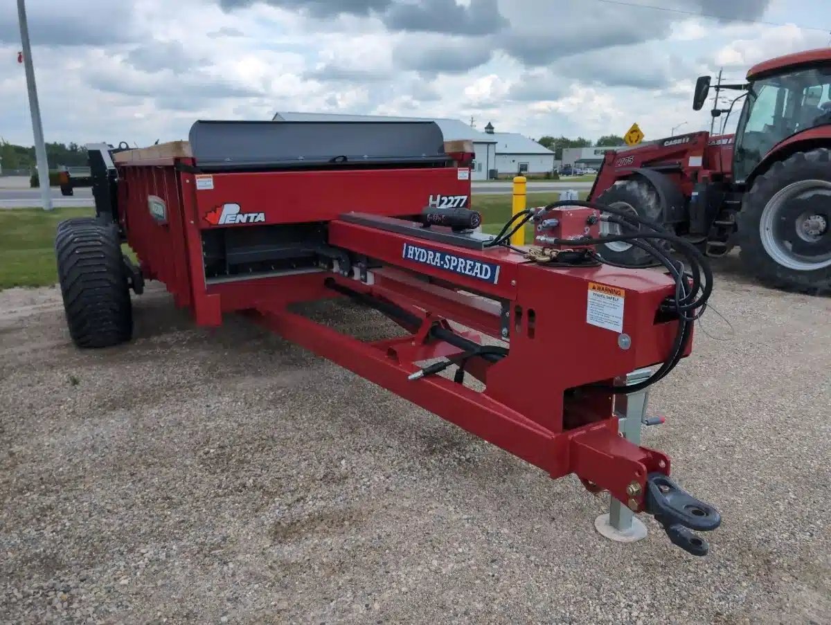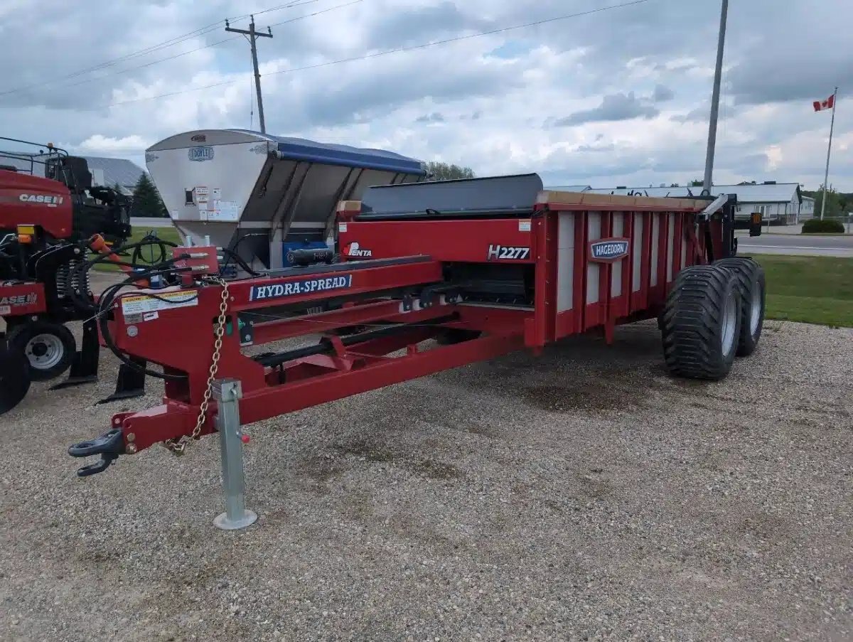 2024 Hagedorn 2277 Hydra Push Manure Spreader. 524 Heaped / 270 Struck cu/ft Capacity, Dual Horizontal Beaters, Oscillating Tandem axles, 550/60R22.5 Traction Implement Radial Tires, Removable Beater Assembly, Hydraulic End Gate and 24000lb Carrying Capacity. Old Stock Discount Price.