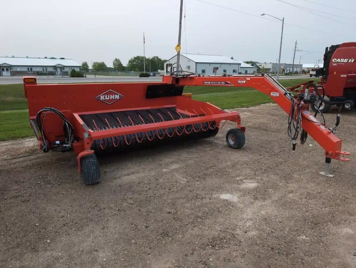 2024 Kuhn MM301 Merger Maxx. 10ft Side Pull Unit w/ 3M 5 Bar Pick Up, Pto Hydraulic Drive Pump, Manual Depth Gauge Wheels, Right Hand Discharge, In Cab Controls and Road light Kit.