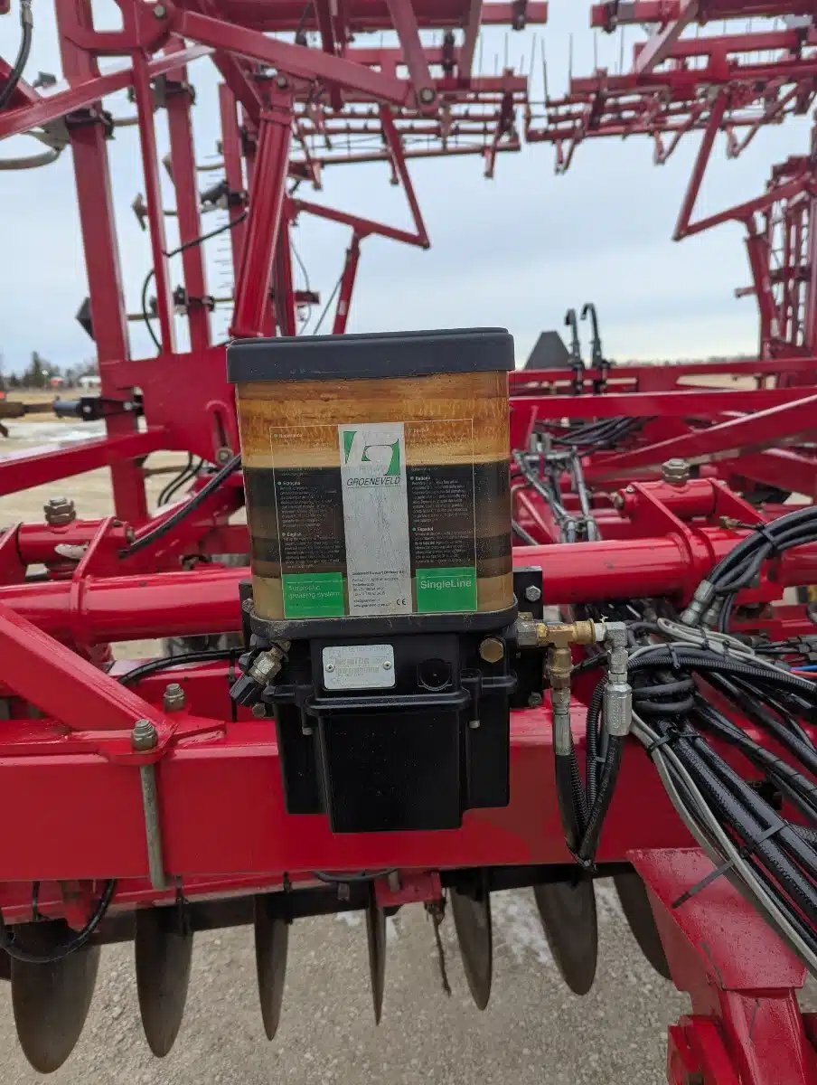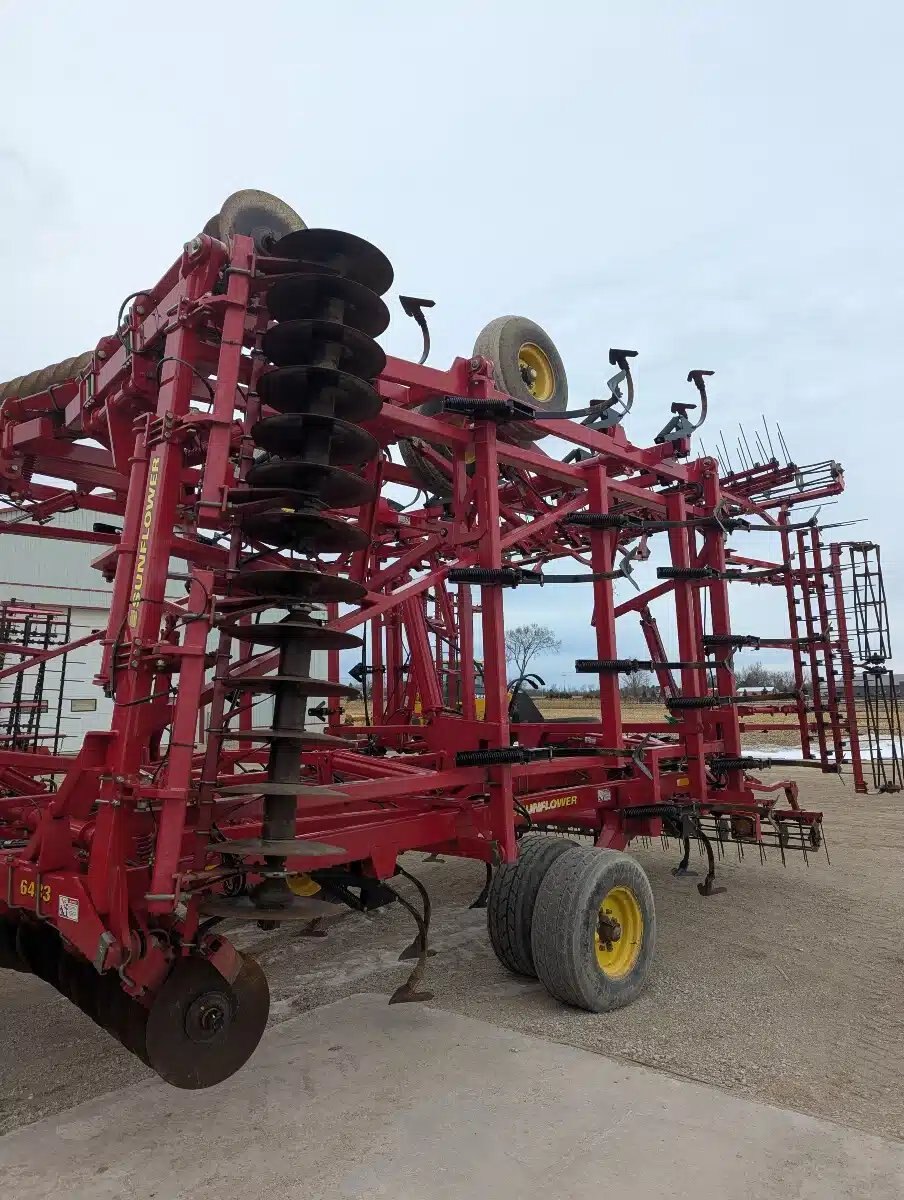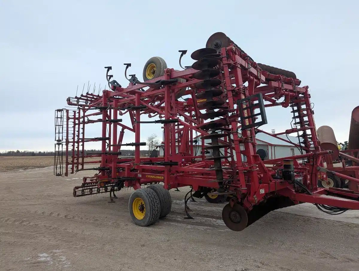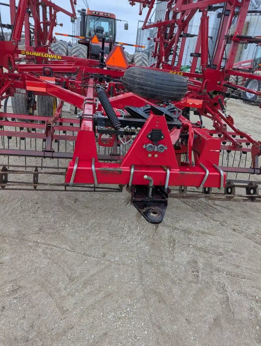 6433 Sunflower Mulch Finisher. 42ft Five Section Triple Fold, Hydraulic Front Disc w/ Scrapers, C Shanks w/ Bolt on Sweeps, 3 Bar Coil Tine w/ Round Bar Rolling Baskets, Walking Tandems and Rear Hitch.