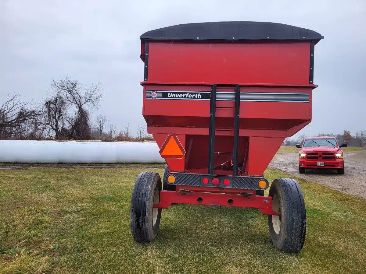 Unverferth 325 Gravity Wagon. 450 Bu Cap Unit w/ LH Unload, Tarp, Light Kit and Sight Glass. Mounted on a 12ton Horst 205 Running Gear w/ Used Truck Tires.