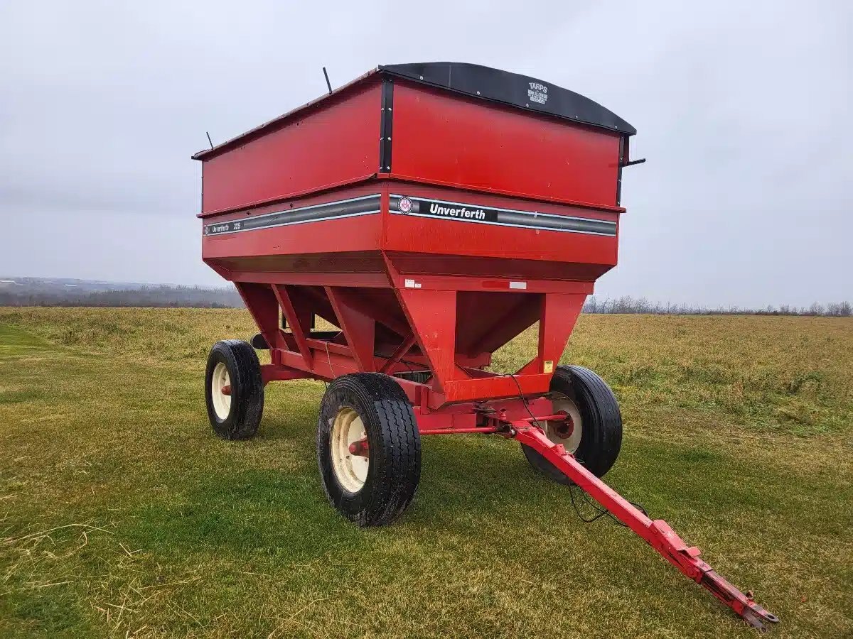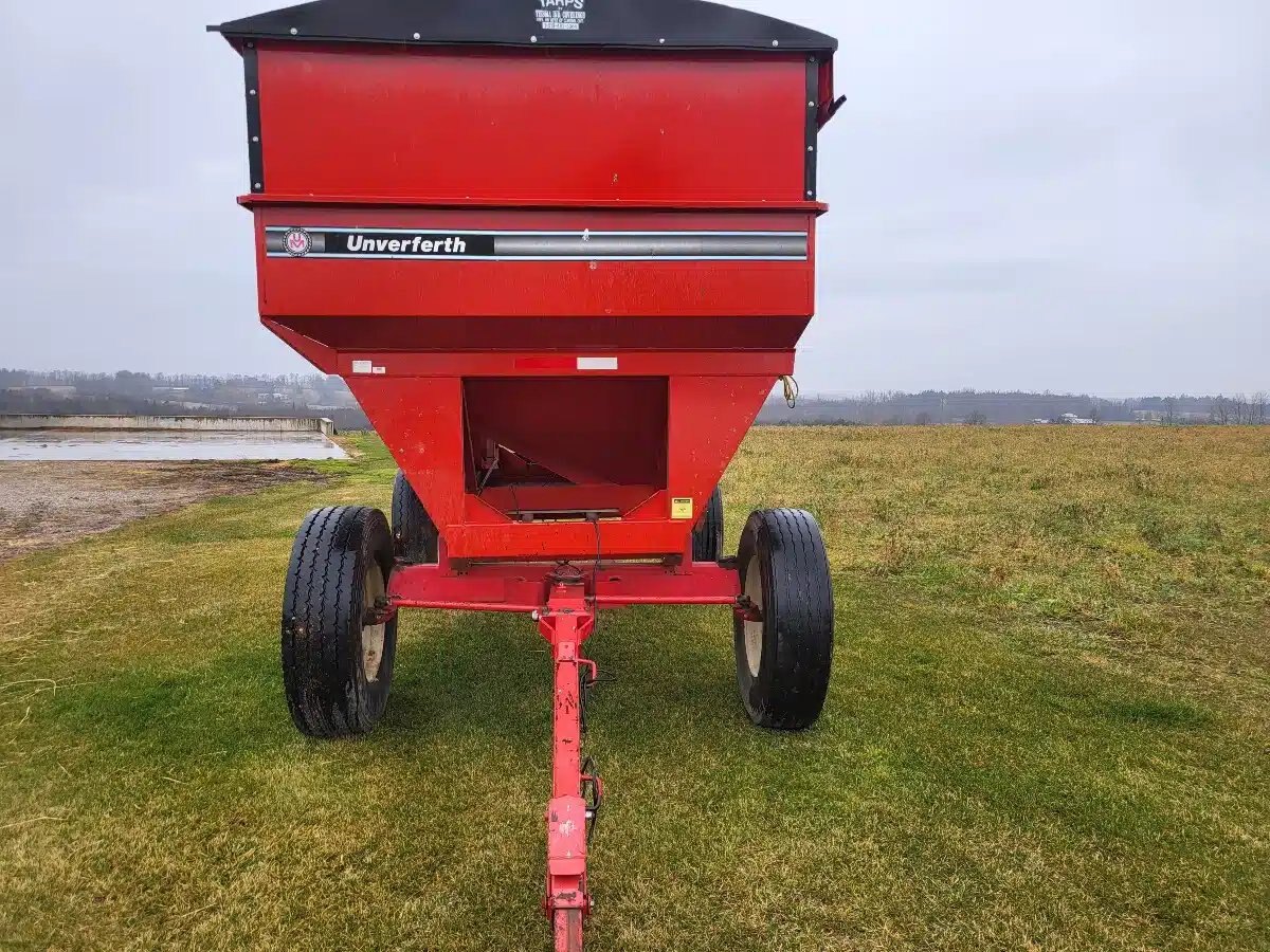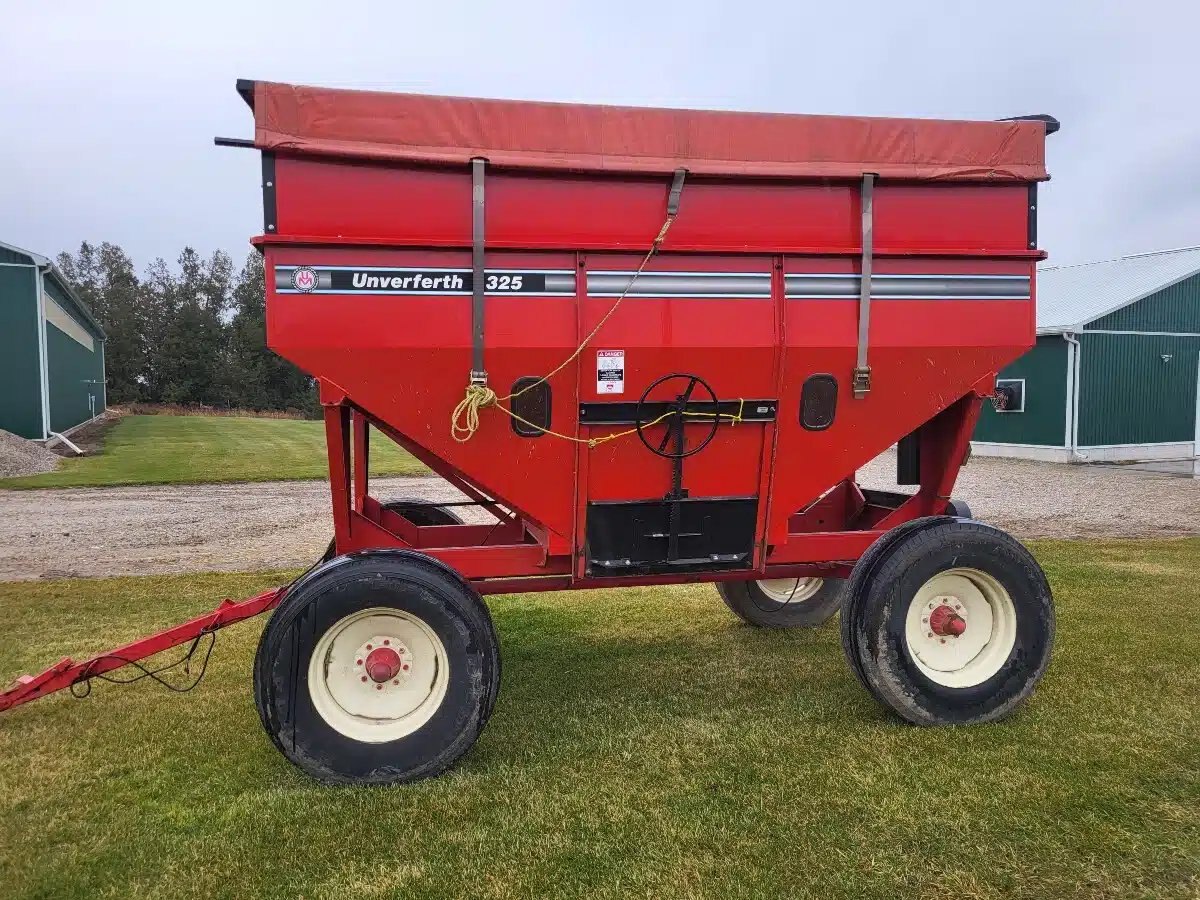 Unverferth 325 Gravity Wagon. 450 Bu Cap Unit w/ LH Unload, Tarp, Light Kit and Sight Glass. Mounted on a 12ton Horst 205 Running Gear w/ Used Truck Tires.