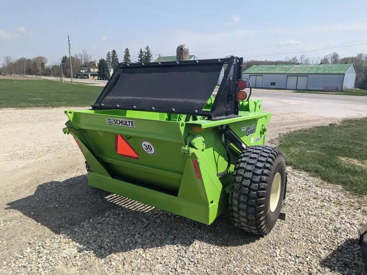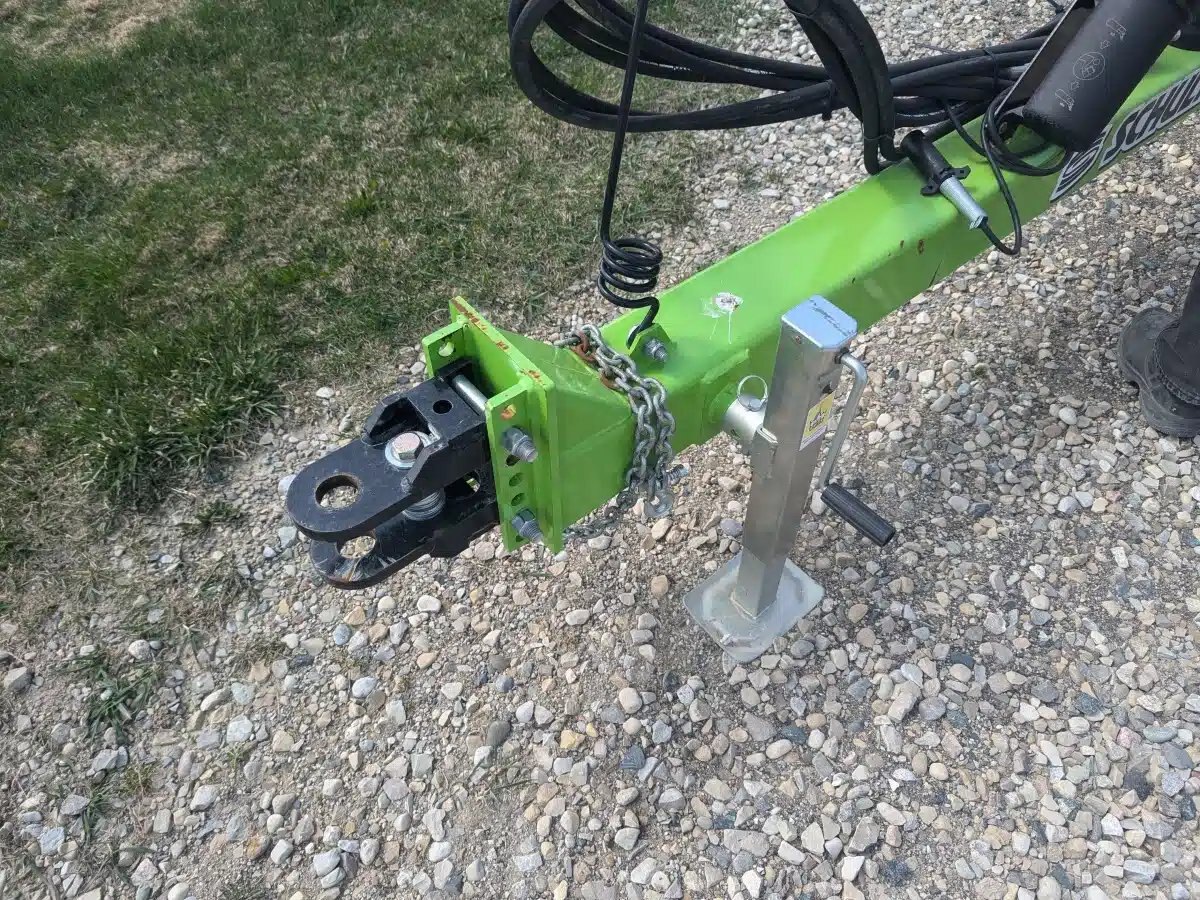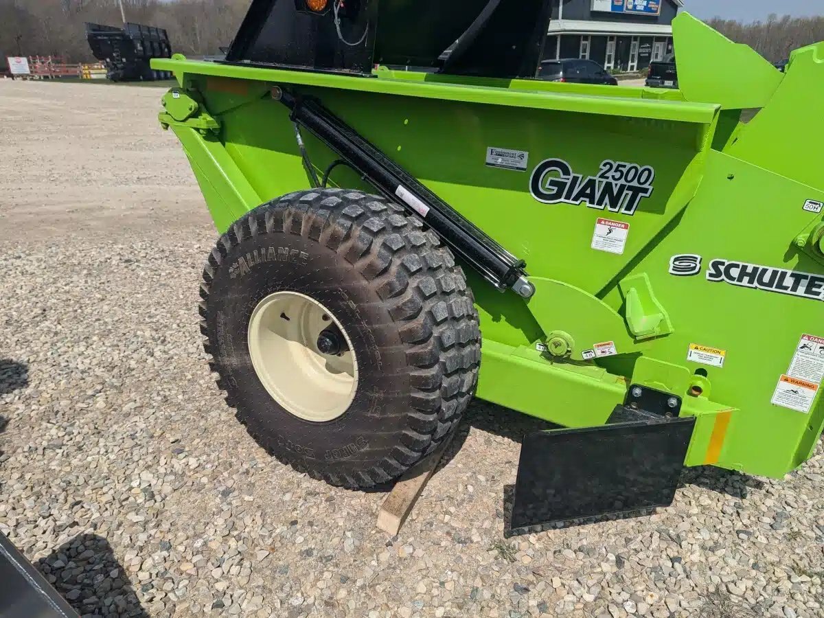 Schulte Giant 25400 Stone picker. Hitch-mounted unit with capacity of 2.5 cubic yard, working width of 60", discharge height of 49", ground working speed of 4mph; requires 12gpm @1800 psi and 75HP. Picks up stones from 2" to 27" in the field.