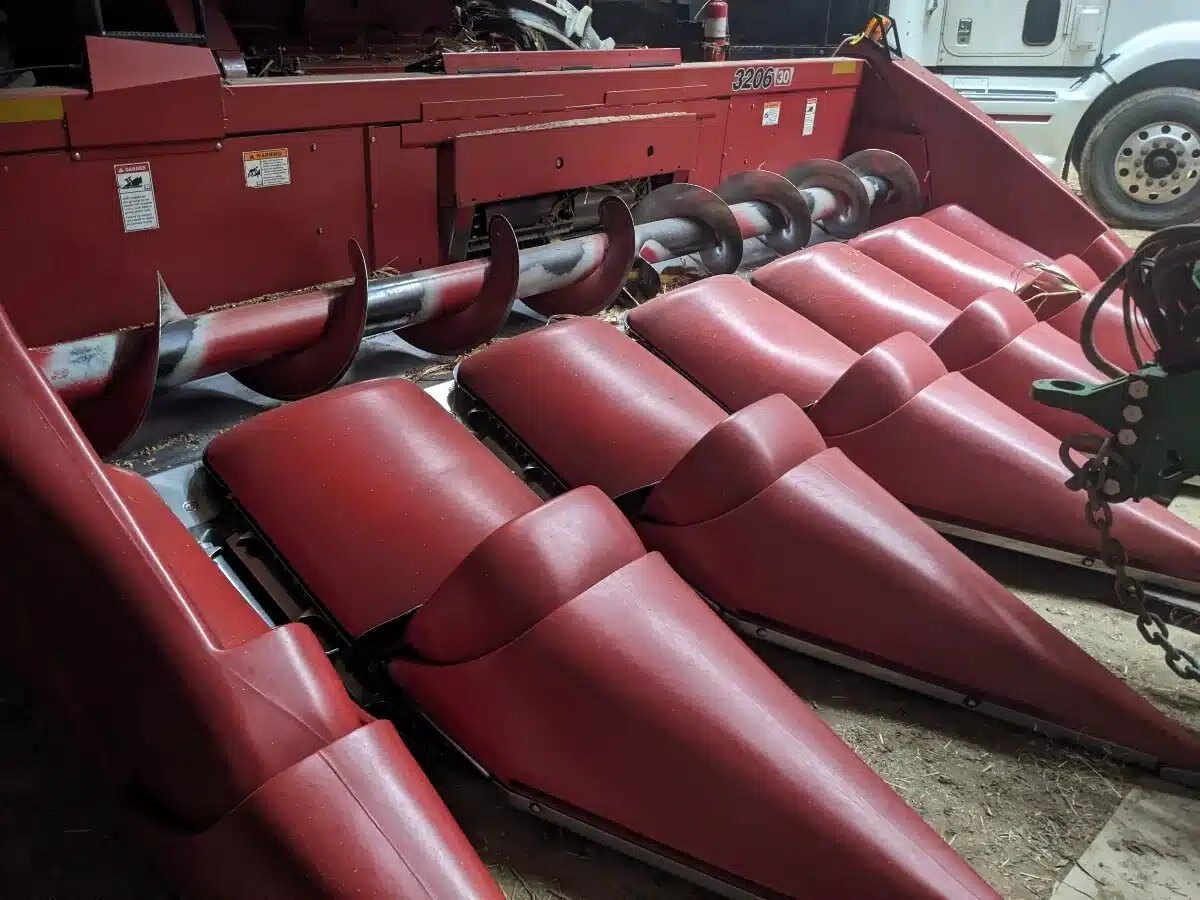 2010 Case IH 3206 corn head. 6 rows on 30" centers with poly snouts and hydraulic deck plates. Fits combine 2577 CIH. Transport carts for corn head available but not included. -- In good condition